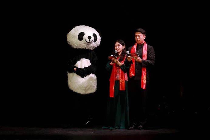 熊猫人偶与青年学生主持(张健勇 摄)