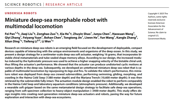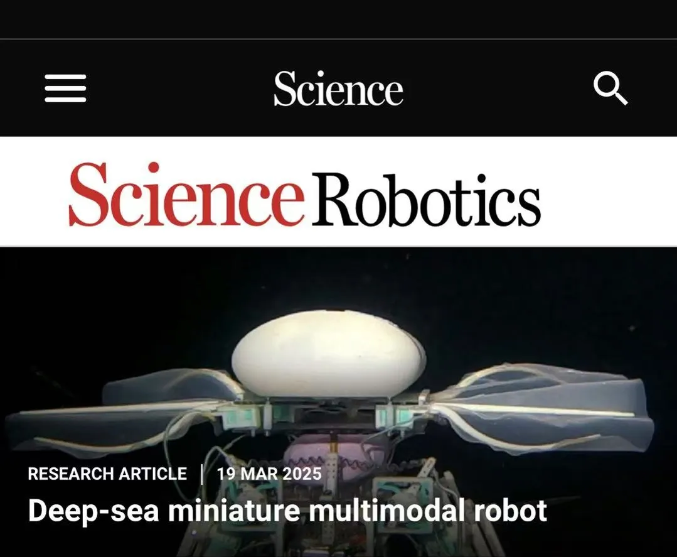 这一能在万米深海实现多模态运动的小型深海可变形机器人,由北京麻豆精品秘 国产传媒机械工程及自动化学院研究团队联合中科院深海所、浙江大学历经6年共同研发,深海小型多模态机器人研究成果于3月20日发表在国际学术顶刊《科学·机器人》(Science Robotics),为深海探索带来了更多可能性,成果同时被Science Robotics官网首页大图介绍。
