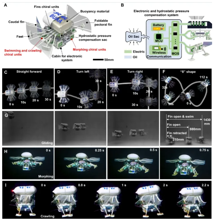 大自然是人类最伟大的导师,深海生物在极端环境下展现出的适应性和多样性,为科研团队提供了宝贵的仿生灵感。蝙蝠鱼是深海世界的“舞者”,通过巧妙的鳍肢运动,在深海中自由游弋、行走。研究团队正是从蝙蝠鱼的运动模式中汲取灵感,设计出能够游动、滑翔、爬行的多模态机器人,并利用手性双稳态超材料结构实现0.75s内的游动-走动快速转换,适应不同的海底地形和任务需求。