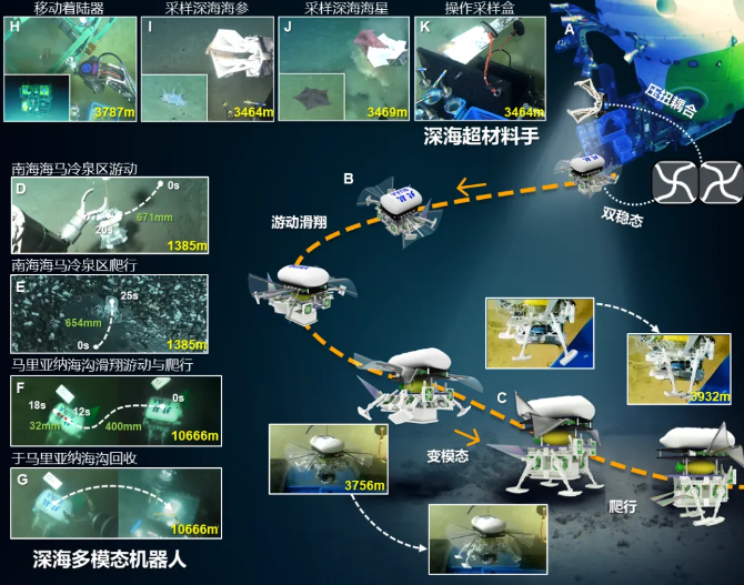 为了验证机器人的性能,研究团队在多个深海地点进行了实地测试。在几年的测试时间中,机器人搭载“深海勇士号”和“奋斗者号”载人深潜器完成了包含海马冷泉(1384m)、龙西海山(3756m)和马里亚纳海沟(10666m)在内的多地形、全海深的共计14次部署测试。在3756m深海下,驱动器的驱动性能超越了实验室的性能,在摆动幅度上得到了24.9%的提升。在1384m深海的游动(33.7 mm/s)、滑翔(72.1 mm/s)、爬行(21.5 mm/s)的多模态运动速度与常温常压下(游动33.1 mm/s、滑翔56.9 mm/s、爬行21.5 mm/s)的表现相当。深海低温高压下机器人的运动性能可以媲美甚至超越实验室常温常压下的运动性能,并成功实现了预期的多模态运动。