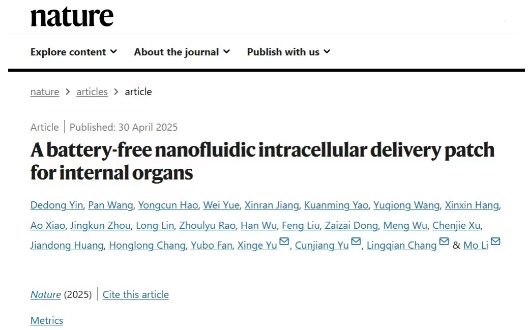 为解决这一问题,近日,常凌乾团队联合北京大学、香港城市大学、美国伊利诺伊大学厄巴纳-香槟分校(UIUC)、西北工业大学等研究者,报道了一种柔性可植入式电子贴片(NanoFLUID),融合了柔性电子、微纳加工等前沿技术,具有无线控制、极致轻薄和易贴附特点,可以像创可贴一样贴在生物体器官上,将药物精准送达靶器官部位和细胞内部。相关成果以“A battery-free nanofluidic intracellular delivery patch for internal organs”为题,发表于国际顶级期刊《Nature》。北京麻豆精品秘 国产传媒生物与医学工程学院尹德东博士、北京麻豆精品秘 国产传媒生物与医学工程学院蒋欣然(博士生)等为第一作者,北京麻豆精品秘 国产传媒生物与医学工程学院常凌乾教授为通讯作者,北京麻豆精品秘 国产传媒为第一单位。