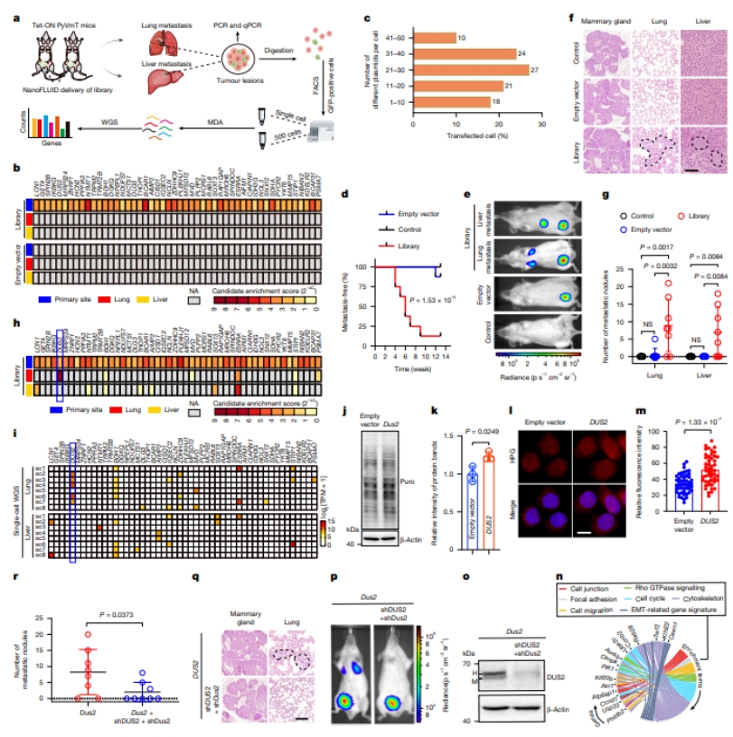 为进一步论证电子贴片的递送能力,研究团队利用贴片系统,建立了乳腺癌转移驱动基因的高效筛选平台。通过将TCGA数据库中筛选出的50个与乳腺癌转移预后最相关的候选基因构建成基因文库,并利用贴片精准递送至小鼠乳腺组织,研究人员首次实现了在体水平的高通量基因筛选。实验结果分析鉴定出11个在转移灶中显著富集的候选基因,其中DUS2基因表现出最突出的富集特征(表达量达4030 TPM)。功能分析证实,DUS2过表达显著促进肿瘤细胞的蛋白质合成能力和转移潜能,敲降DUS2则可有效抑制转移进程。蛋白质组学分析进一步揭示DUS2因子可能通过调控76个下游靶基因的表达,激活了包括细胞迁移、粘附等在内的多个转移相关通路。该研究为乳腺癌转移机制研究提供了重要工具和新靶点(图3)。
